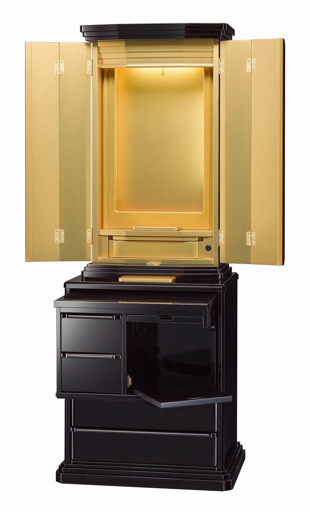 「雄飛」は、深い黒の色調が特徴的な仏壇で、落ち着いた雰囲気を演出します。シンプルながらも高級感のあるデザインは、どんなインテリアにもマッチし、心を静める特別な空間を作り出します。伝統的な美しさが感じられ、厳かな空間をお求めの方に最適です。